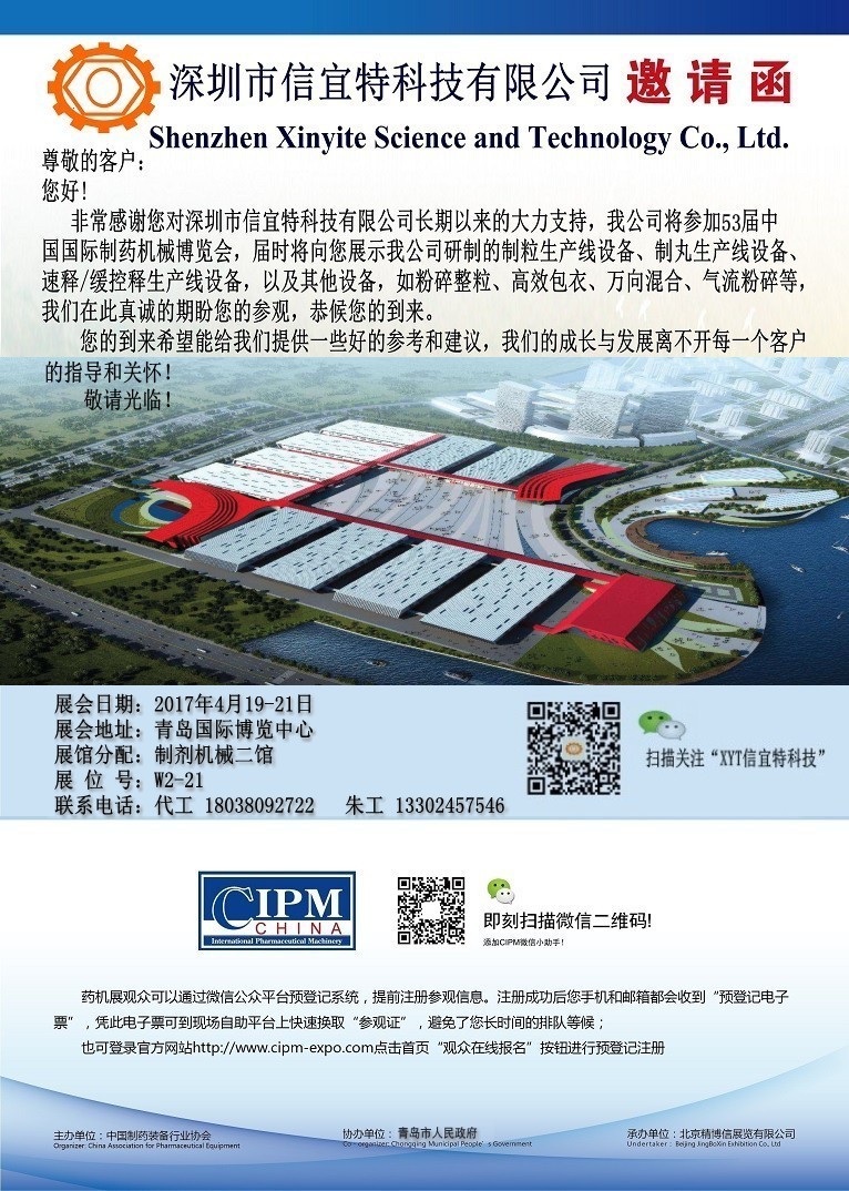 非常感謝您對深圳市信宜特科技有限公司長期以來的大力支持,我公司將參加53屆中 國國際制藥機械博覽會,屆時將向您展示我公司研制的制粒生產(chǎn)線設(shè)備、制丸生產(chǎn)線設(shè)備、 速釋/緩控釋生產(chǎn)線設(shè)備,以及其他設(shè)備,如粉碎整粒、高效包衣、萬向混合、氣流粉碎等, 我們在此真誠的期盼您的參觀,恭候您的到來。 您的到來希望能給我們提供些好的參 考和建議,我們的成長與發(fā)展離不開每一個客戶 的指導和關(guān)懷!